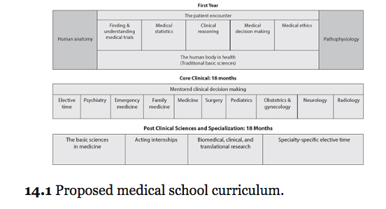 «Los tradicionales estudios preclínicos deberían desaparecer para que los alumnos aprendieran a enfrentarse a los enfermos desde la experiencia empírica más que desde la teoría científica que puede o no explicar cómo o por qué una determinada intervención funciona. El curriculum debería incluir habilidades en razonamiento clínico y toma de decisiones, técnicas de búsqueda en la literatura científica y lectura crítica»