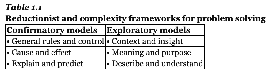 (2) Las ciencias de la complejidad lo hacen de forma exploratoria: basándose en contextos y autoreflexión; estableciendo relaciones en una lógica de significados y propósitos; resolviendo los problemas a través de la descripción y la comprensión
