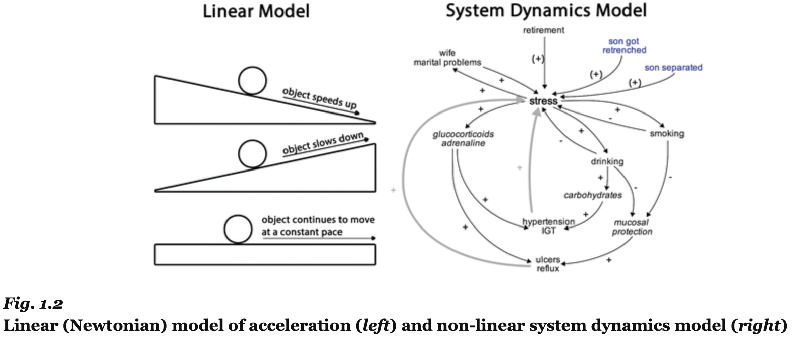 Reduccionismo y complejidad también tendrían presupuestos relacionales o dinámicos muy diferentes: el modelo dinámico lineal vs la dinámica de sistemas (ver la figura).