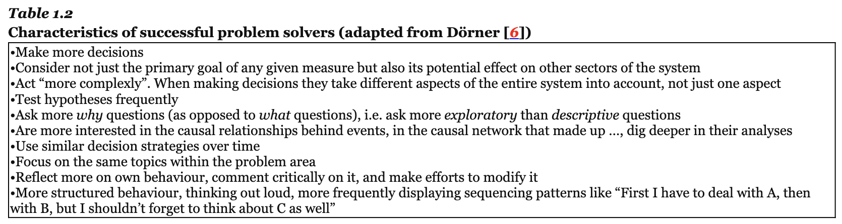 Para ser capaces de abordar la complejidad necesitamos otro tipo de habilidades. Arriba podemos ver las características asociadas a las personas efectivas en la solución de problemas complejos: más decisiones; consideración no solo del objetivo primario sino también los posibles efectos de la intervención en otras áreas del sistema; consideración de varias aspectos del problema, no solo uno; comprobar la validez de nuestras hipótesis de trabajo con frecuencia; preguntarse más por el por qué y menos por el qué (ser más exploratorio que descriptivo); interés en las causas de las causas; autoreflexión; o estructuración explícita de las intervenciones.