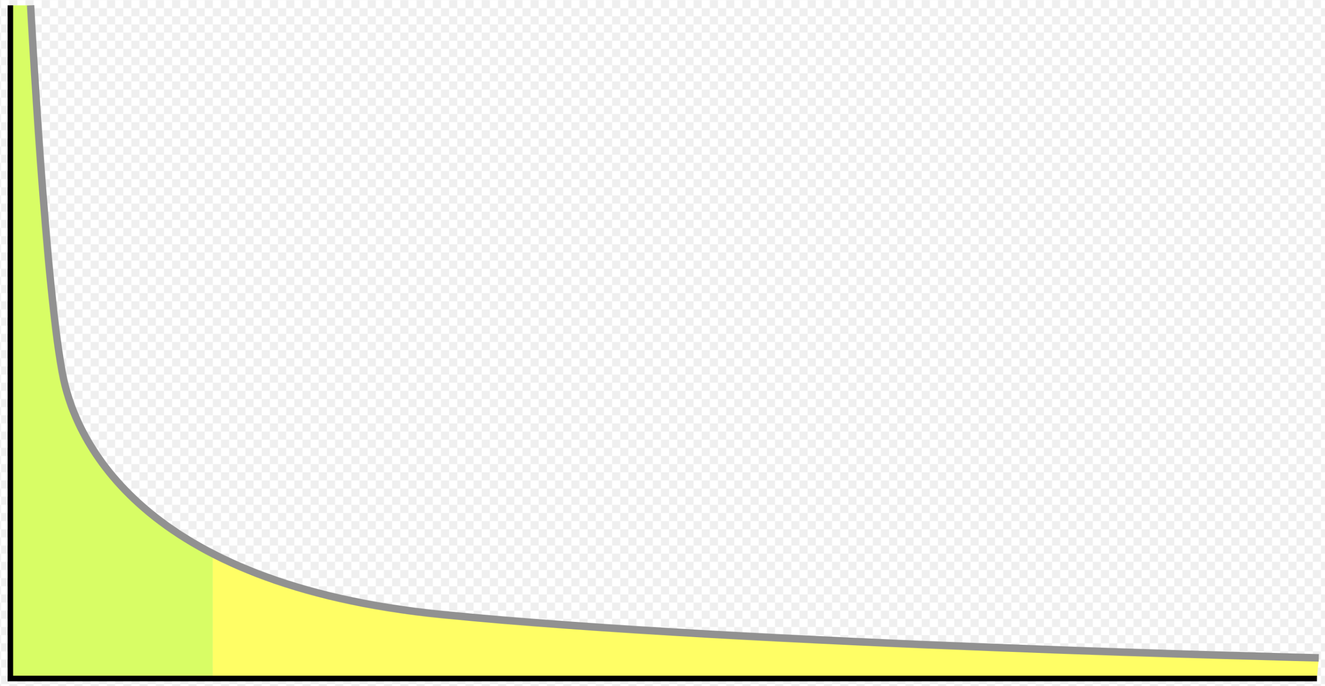 (1) Los procesos son de larga cola (distribución de Pareto): una amplia frecuencia o gran frecuencia de los procesos es seguida por una baja frecuencia o baja amplitud que disminuye gradualmente. En muchos casos, los acontecimientos de baja frecuencia o escasa amplitud —la larga cola, representada arriba por la porción amarilla del gráfico— pueden abarcar la mayor parte del gráfico