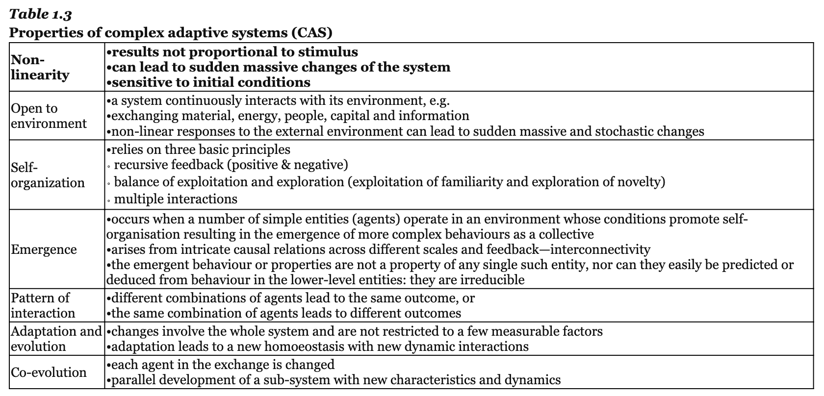 Los Sistemas Complejos Adaptativos (SCA) tienen una serie de características que pueden verse la tabla arriba: no linealidad, apertura al contexto, auto-organización, emergencia, patrón de interacción imprevisible, evolución adaptativa y co-evolución.