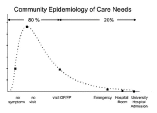 Para Sturmberg la salud debe ser el eje del sistema sanitario del siglo XXI. La experiencia de salud en la comunidad sigue una distribución de Pareto (ver figura arriba): la mayoría de las personas se sienten suficientemente sanas; muchas perciben problemas de salud que les hacen consultar en atención primaria pero que no requieren intervenciones enfermedad específicas; solo unos pocos requerirán intervenciones más especializadas que necesitan alta tecnología.