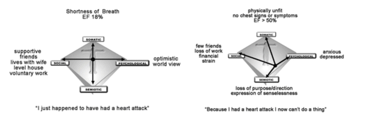 Sturmberg pone el ejemplo de dos personas (tiene un interesante artículo al respecto) con un infarto de miocardio. La de la izquierda tiene una importante pérdida de funcionalidad cardiaca (FE<18%) pero equilibra los cuatro factores gracias a un contexto social y un armazón emocional mejor que el paciente de la derecha, que objetivamente ha quedado menos deteriorado funcionalmente pero que hace una interpretación semiótica de pérdida de propósito y esperanza.