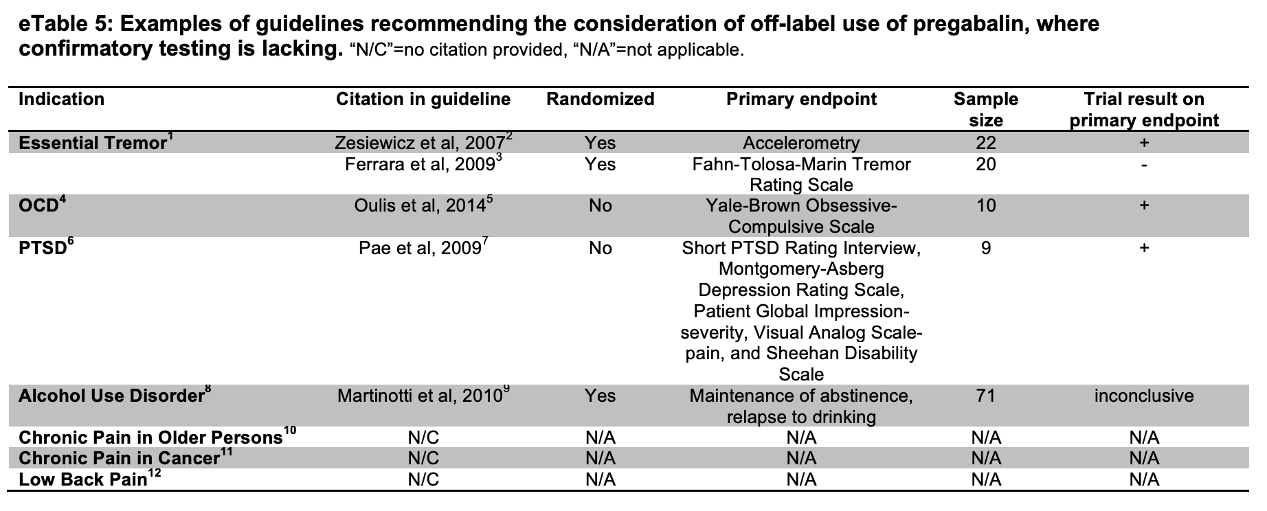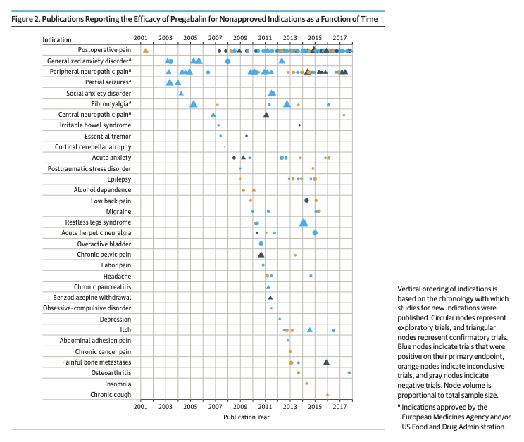 En la tabla arriba pueden verse todas las indicaciones fuera de ficha técnica en las que se probó la pregabalina mediante ensayos clínicos de baja calidad desde el año 2001. En palabras de los autores: