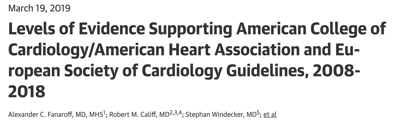 «En esta revisión sistemática de 51 documentos de directrices actuales que incluían 6329 recomendaciones, el 8,5% de las recomendaciones de las directrices de ACC/AHA y el 14,3% de las recomendaciones de las directrices de ESC se clasificaron como nivel de evidencia A (respaldado por la evidencia de múltiples ECAs), en comparación con el 11,5% de las recomendaciones en una revisión sistemática de las directrices de ACC/AHA realizada en 2009.»