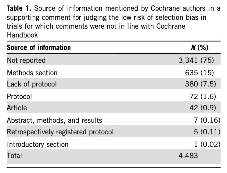 En los 4.483 ensayos restantes (91,5%), juzgados con una puntuación baja de riesgo de sesgo de información selectiva, los autores de Cochrane no proporcionaron información convincente que justificara el juicio realizado y, por tanto, la evaluación del sesgo no era conforme con la norma Cochrane.