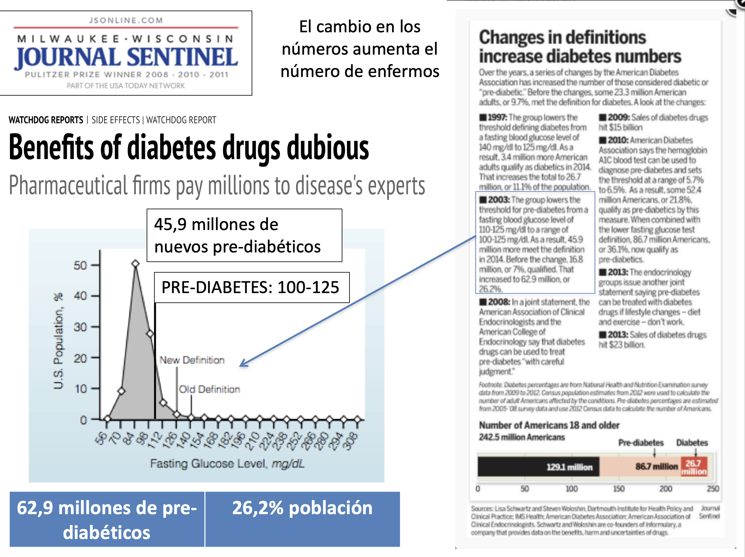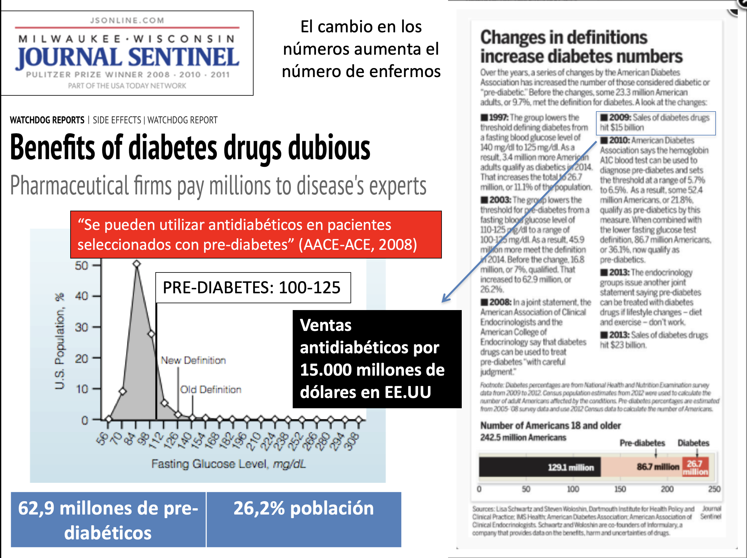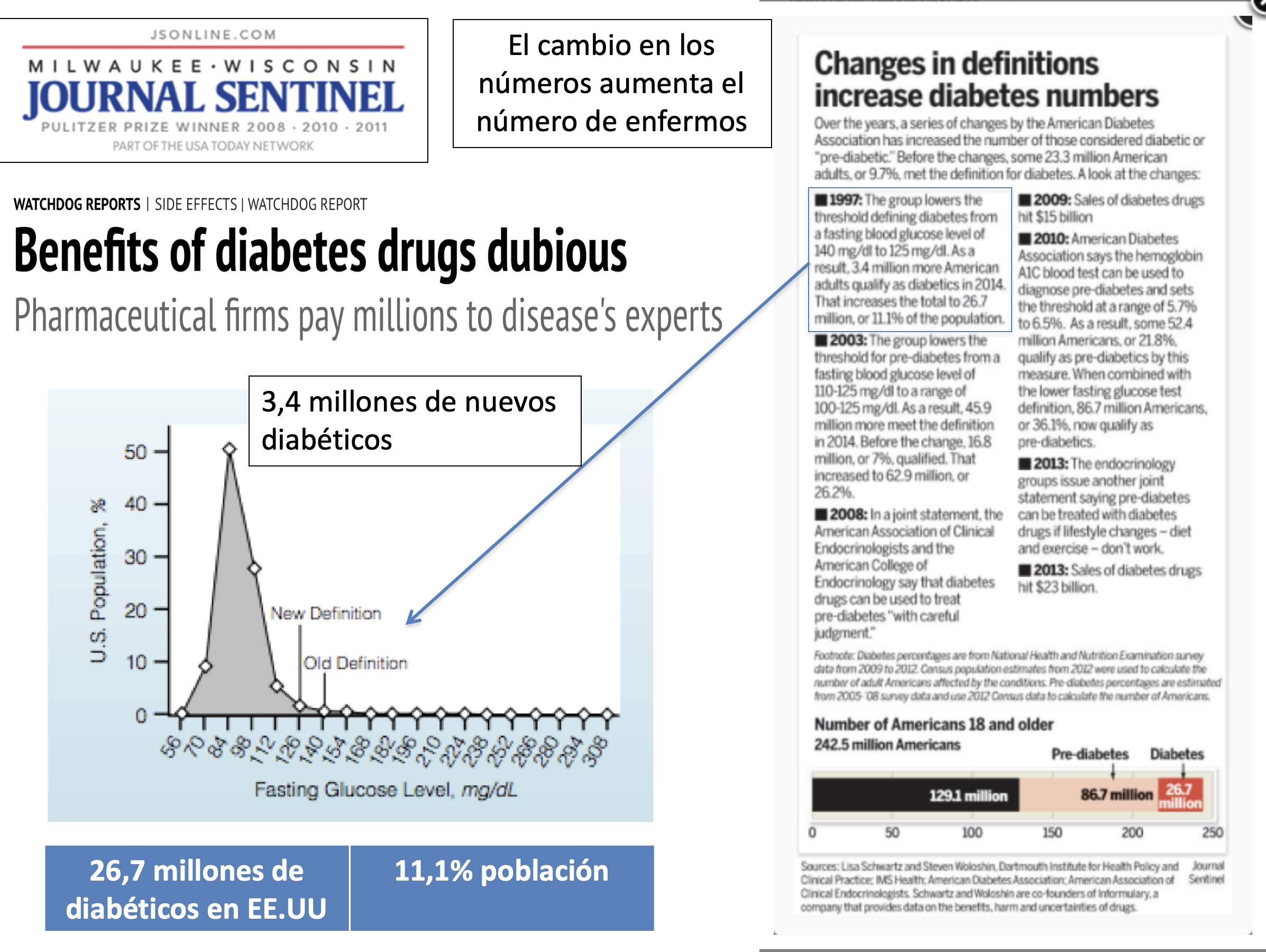 El aumento de la incidencia de diabetes es un buen ejemplo. Arriba podemos ver las consecuencias de los paulatinos cambios en la definición de diabetes y prediabetes. Hoy en día: