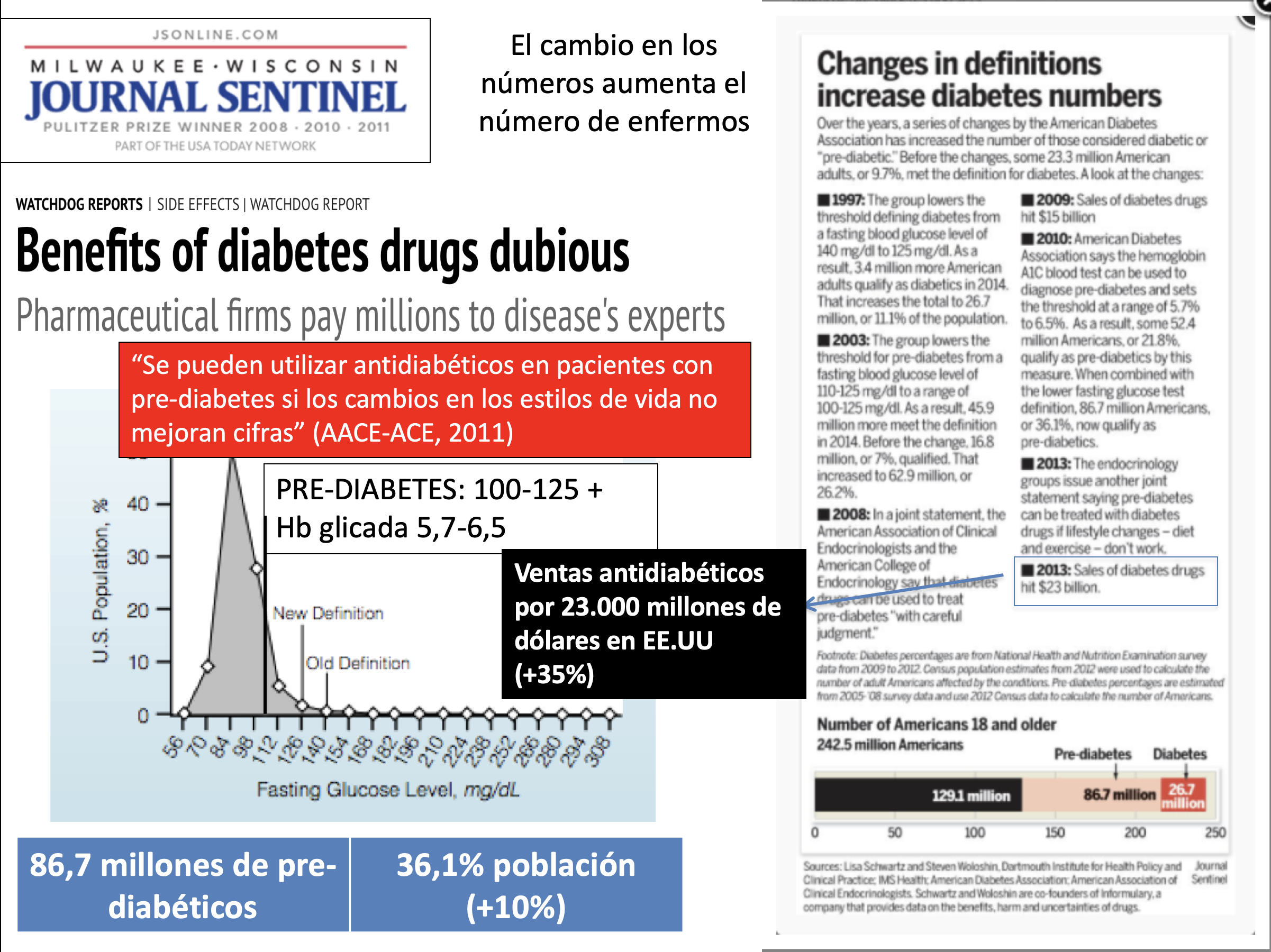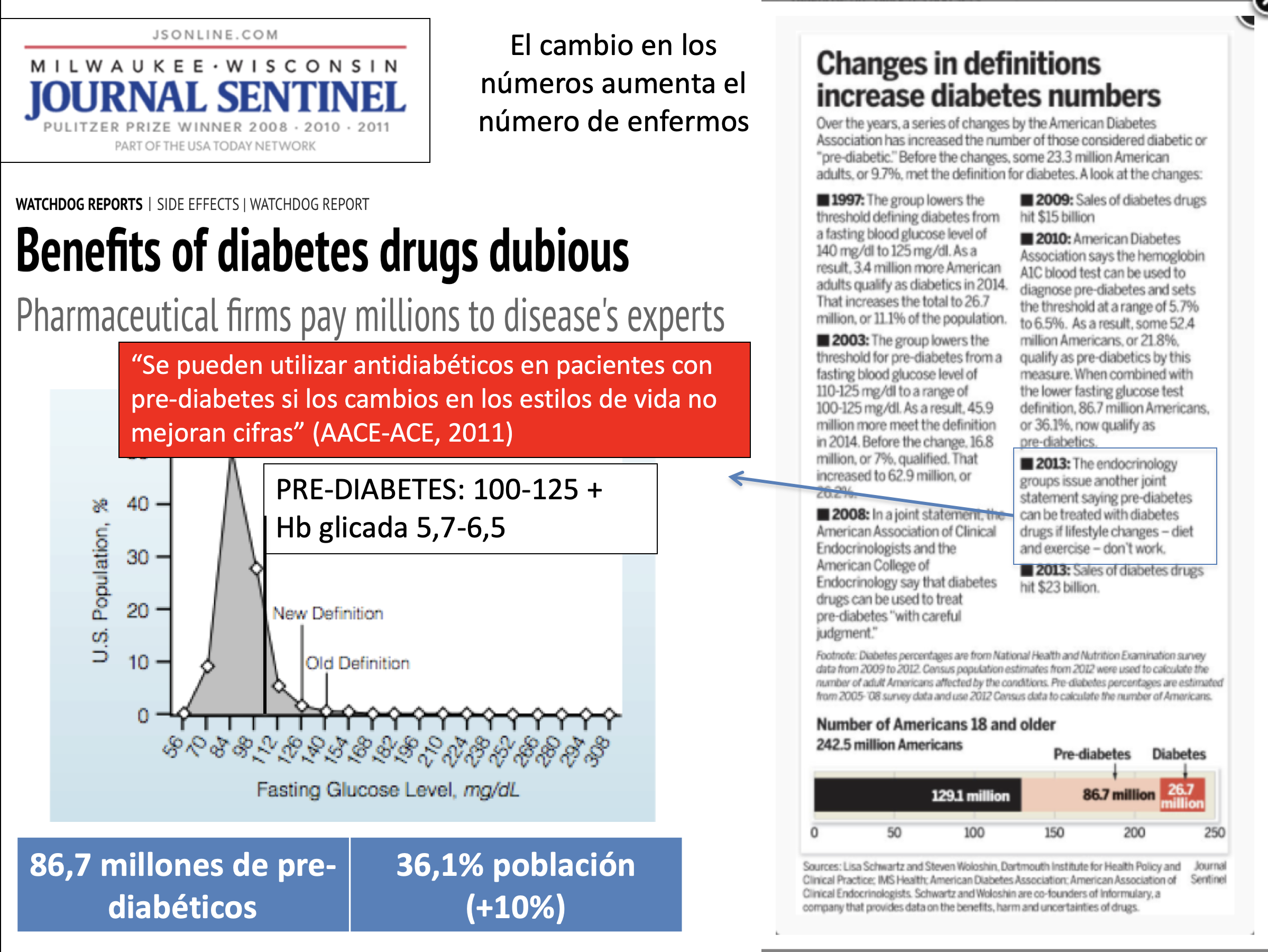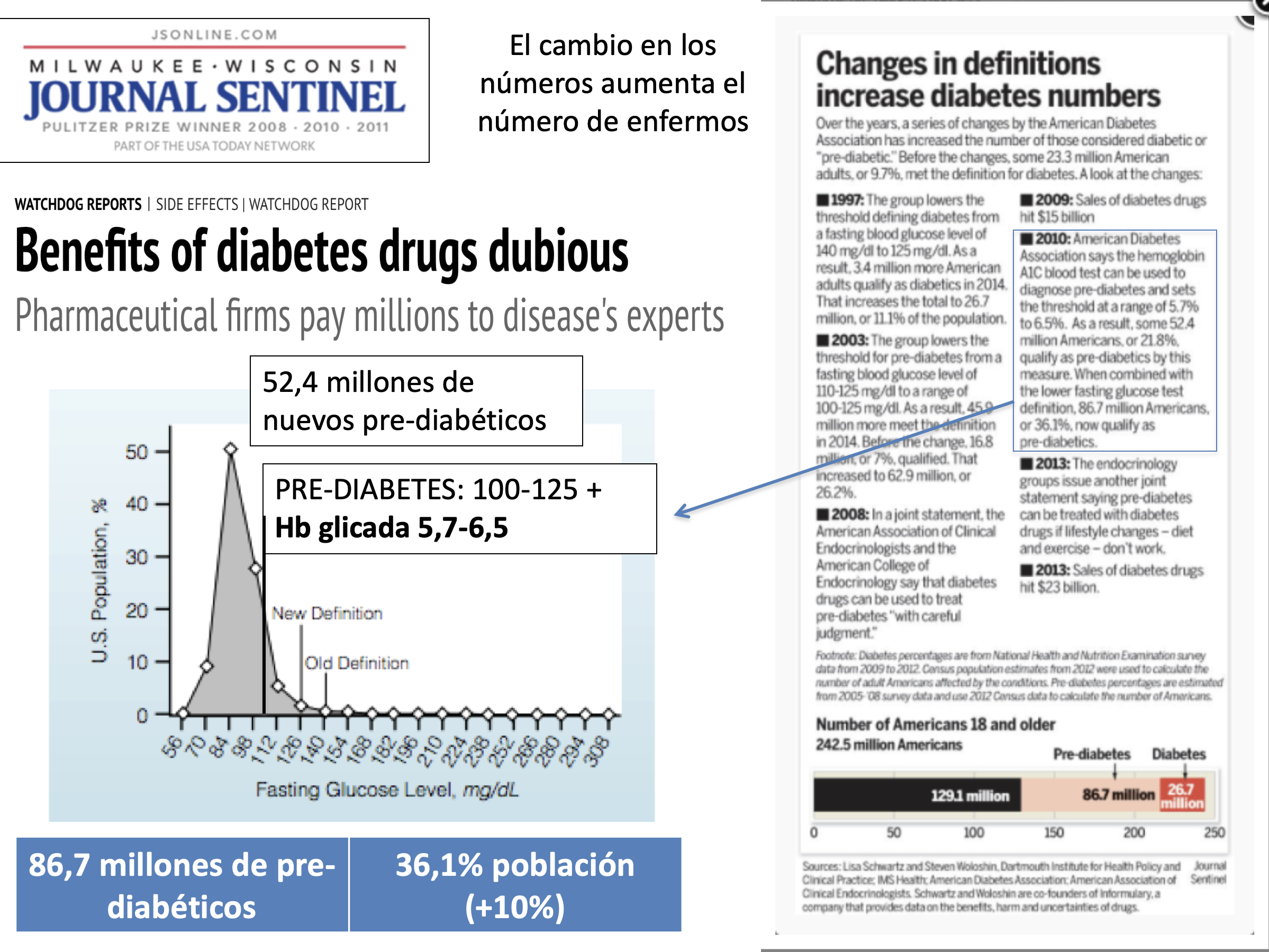 El aumento de la incidencia de diabetes es un buen ejemplo. Arriba podemos ver las consecuencias de los paulatinos cambios en la definición de diabetes y prediabetes. Hoy en día: