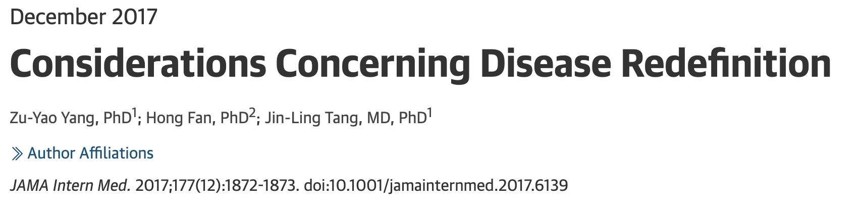«En los 50 años transcurridos desde que se publicó en la revista JAMA el primer ensayo que mostraba los beneficios del tratamiento de los pacientes con tensión elevada, la hipertensión se ha ampliado desde una definición estrecha (presión arterial diastólica >115 mm Hg), que incluía sólo una pequeña proporción de la población, hasta una definición más amplia (presión arterial >130/80 mm Hg) que ahora incluye aproximadamente el 46% de los adultos de los Estados Unidos»