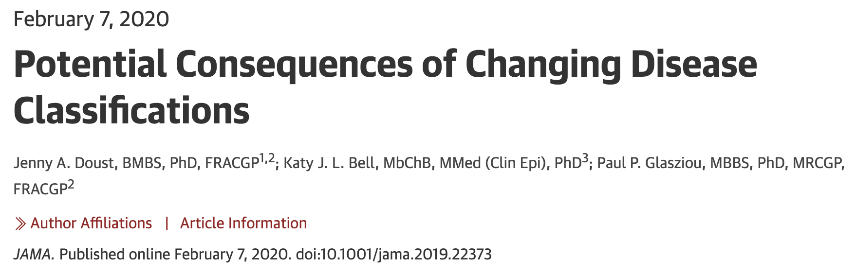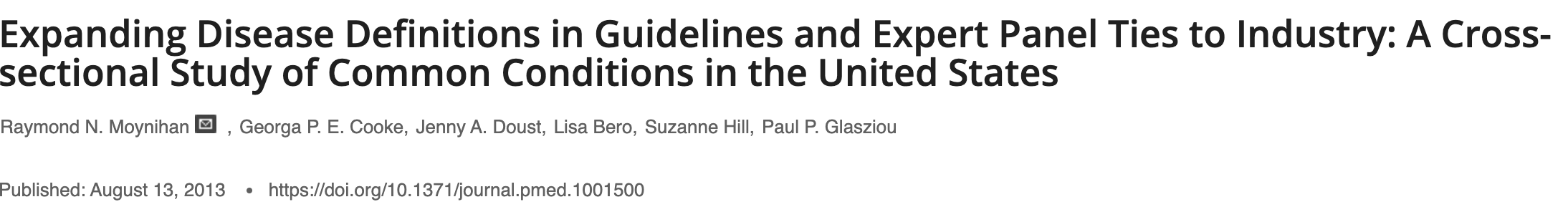 «Los clínicos tienden a pensar que las enfermedades son inmutables, que existen en la naturaleza como los elementos de la tabla periódica o los planetas. La literatura médica refuerza este mito cuando trasmite la idea de que los cambios son el resultado del aumento del conocimiento científico que mueve a la medicina hacia descripciones mejores y más precisas de entidades que están en la naturaleza. Pero, de hecho, las enfermedades no son fijas, e incluso con enfermedades comunes (como la diabetes, la depresión y la anemia), sus definiciones han cambiado considerablemente a lo largo del tiempo, con consecuencias significativas, desconocidas y potencialmente dañinas para los pacientes.»