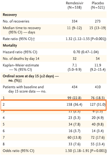 But is this recovery really a hospital discharge? Actually, it is not. The variable measured in this study is the time to go from grades 4-7 on an 8-point ordinal scale (in which 1 is discharge from hospital and 8 is death) to grades 1-3. Only grade 1 is hospital discharge in a normal situation, while grade 2 implies hospital discharge with the need for oxygen therapy and / or limitation of normal activities, and grade 3 is hospitalization, without oxygen requirements and continuous medical care (cases in which «That the hospital stay is prolonged to control the infection»). If we analyze the published data, a majority of patients are in situation 2. Hospital discharge at 15 days actually occurred in 22.8% and 18.5% of patients treated with remdesivir and placebo respectively, where there is no real difference, and it may be due to chance.